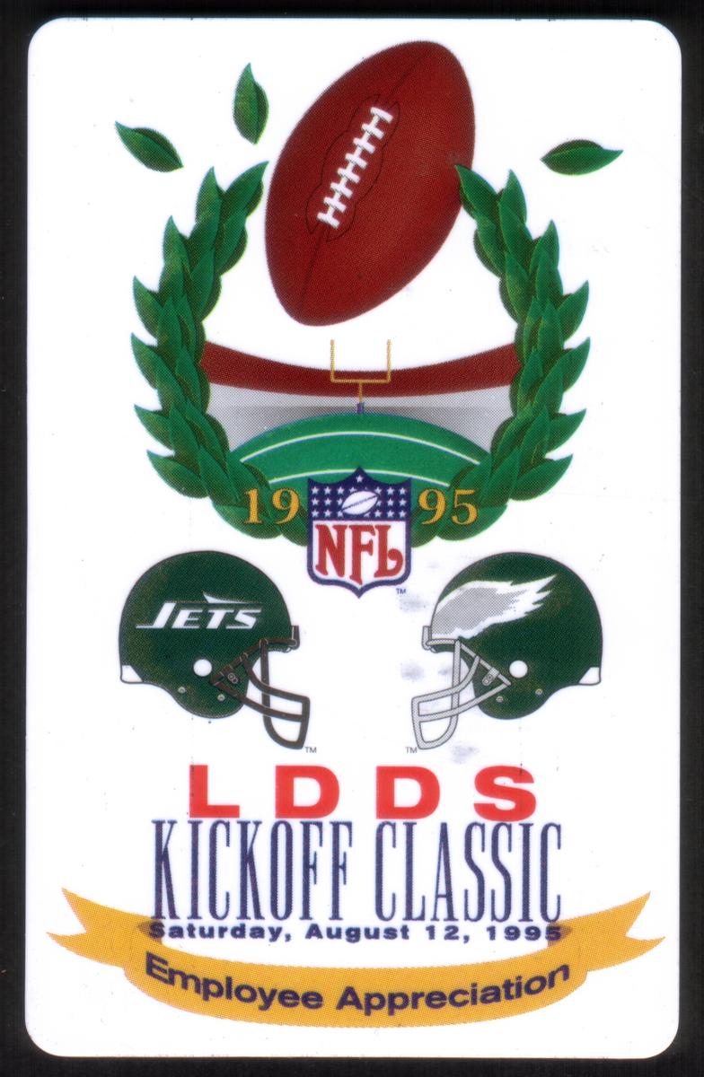 The card highlights the event date, “Saturday, August 12, 1995,” and includes the text “LDDS KICKOFF CLASSIC” in bold lettering, with “Employee Appreciation” featured at the bottom in a gold banner style. The reference to LDDS WorldCom identifies the organization associated with this card. The graphic elements combine NFL football imagery with corporate recognition, making this a collectible item related to the 1995 NFL preseason kickoff event between the Jets and Eagles.