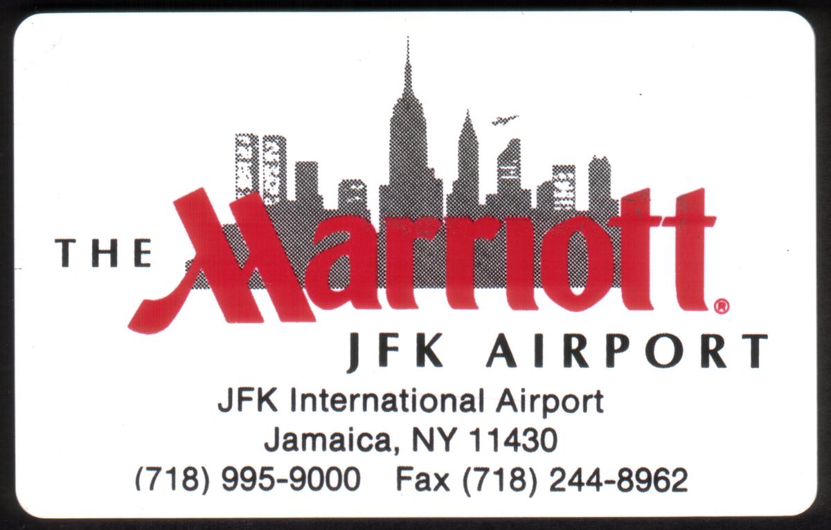 Marriott Hotel at JFK Airport in Jamaica, NY, featuring the iconic logo, NYC skyline with WTC, JFK location details, and contact info for travelers. |