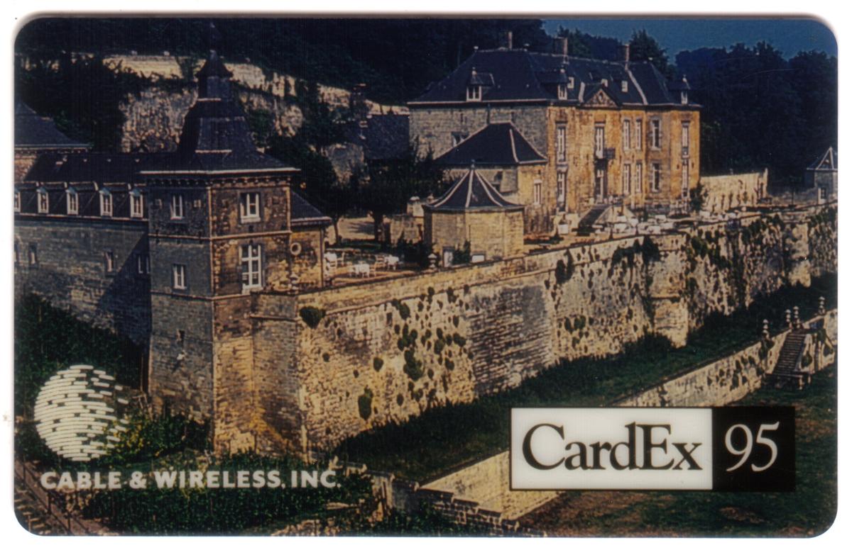 The card’s color scheme features a strong contrast with red and blue tones dominating the background and text elements. The image emphasizes clarity and branding associated with CardEx 1995 and Cable & Wireless, making it an important collectible item for enthusiasts of telecom history and show cards related to international phone card exhibitions.