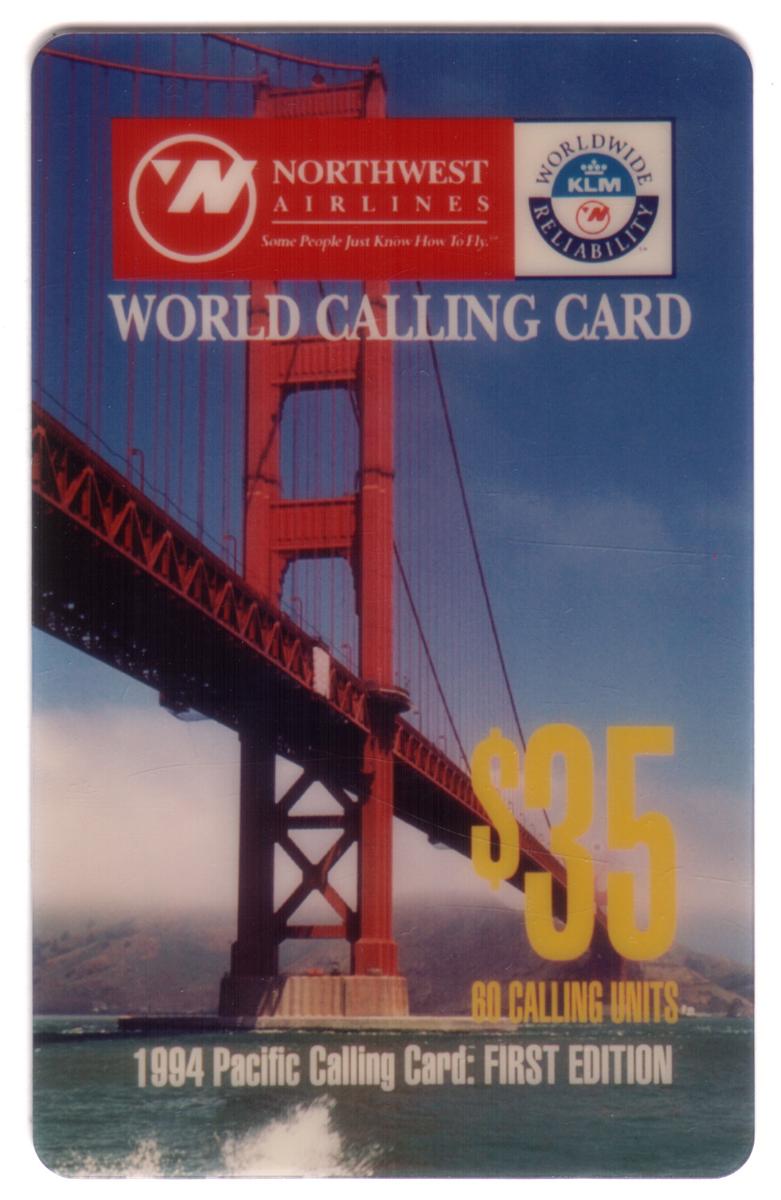 The card’s face displays the text “NorthWest Airlines & KLM 1994 Pacific Calling Card,” indicating its use as a Pacific Calling Card issued in that year. The Golden Gate Bridge is the primary visual element, making the card appealing for collectors interested in bridges, sightseeing, travel, or scenic subjects.
