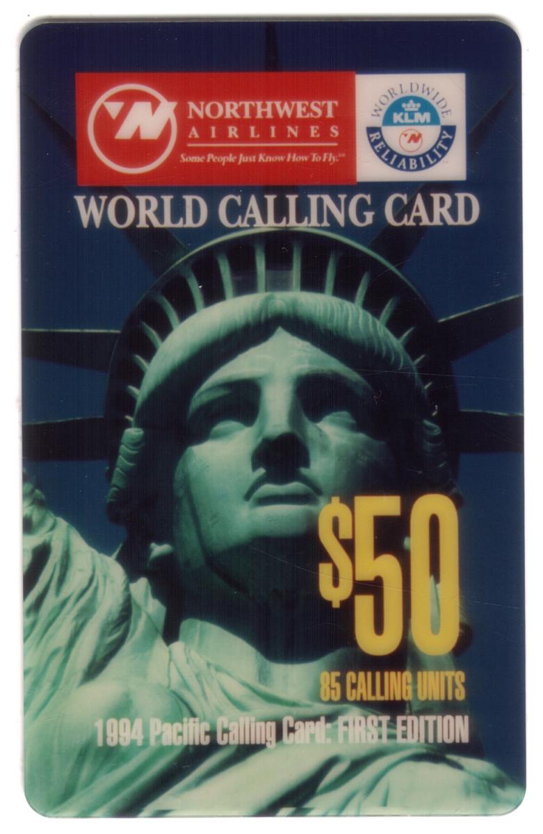 The card is associated with airline companies NorthWest Airlines and KLM, and it was issued in 1994 as part of the Pacific Calling series. It holds a $50 value, making it a first edition from that year. The branding on the card includes LDDS WorldCom, linking it to telecommunication services active during that period.