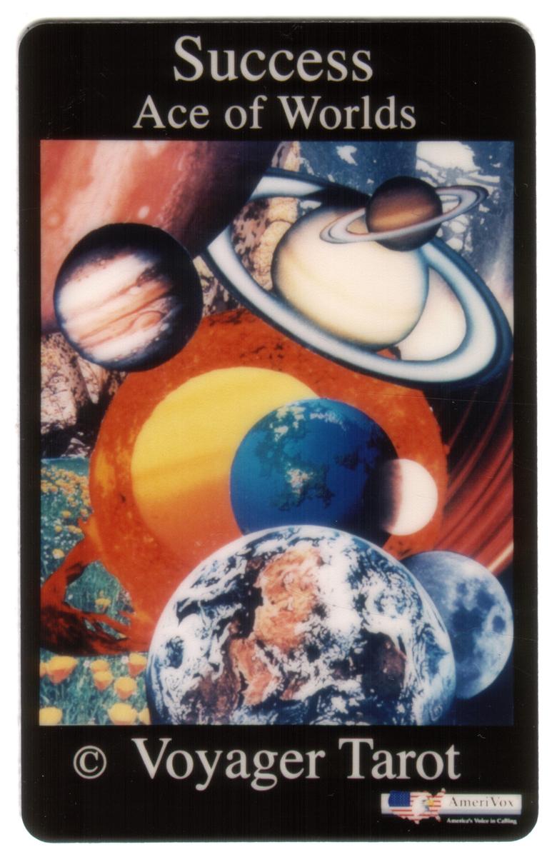 The collectible phone card features detailed artwork from the Ace of Worlds: Voyager Tarot Cards series, specifically highlighting the Artistic Planets theme by AmeriVox. The central figure is an astronaut or space traveler, clad in a predominantly white spacesuit with gold and orange accents, including a gold helmet. Surrounding the figure are representations of planets and celestial bodies rendered in vivid colors, emphasizing themes of space, science fiction, astrology, and mysticism.