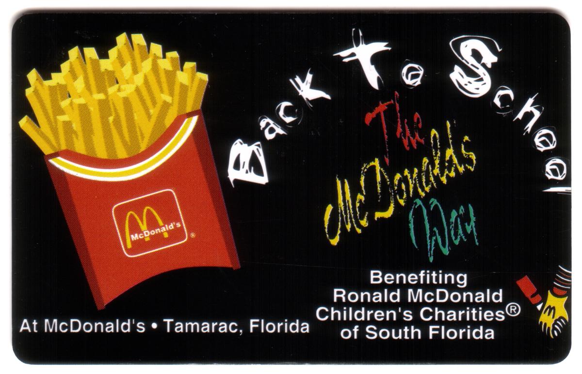 This card represents a fundraising collaboration between McDonald’s fast food restaurants and Ronald McDonald Children’s Charities of South Florida, emphasizing support for education, schools, and children’s charities. The combination of McDonald's branding and the charitable message reflects the card’s function to promote awareness and benefits related to back-to-school efforts in the Tamarac area.