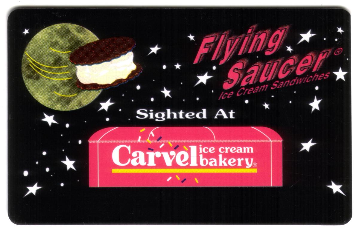 This collectible phone card features a vibrant promotional design for Carvel Ice Cream’s “Flying Saucer” Ice Cream Sandwiches. The card depicts outer space imagery, including planets and stars, giving it a cosmic and playful atmosphere. The Carvel Ice Cream logo is prominently displayed along with the text “10m Carvel Ice Cream ‘Flying Saucer’ Ice Cream Sandwiches.” The background is a deep space scene with globes and stars that highlight the theme of the flying saucer dessert.