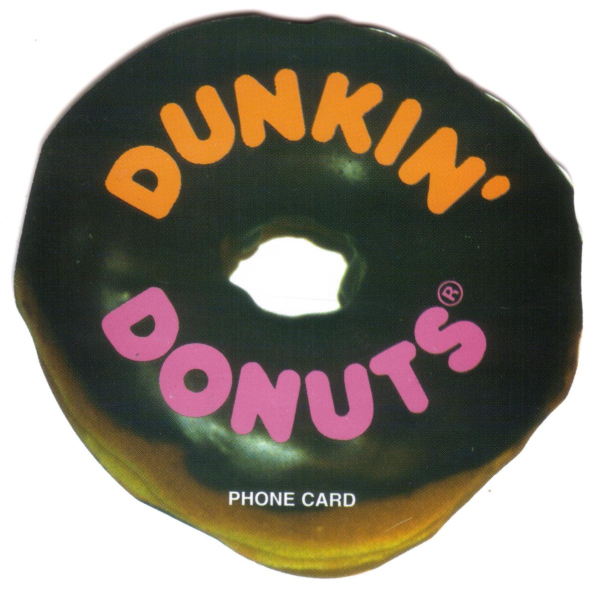 This promotional phone card reflects a combination of advertising and collectible value connected to Dunkin' Donuts, a major player in food and beverage, specifically in donuts and pastries. The die-cut shape and logo use align with common collectible phone card trends highlighting brands and trademarks.