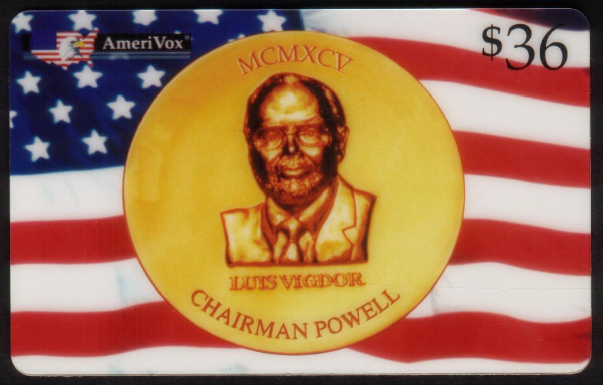 This collectible phone card features a detailed image of Luis Vigdor, identified as the Chairman of Powell & Associates, recognized as the largest USA phone card wholesaler. His name appears prominently along with titles associated with Powell and Associates, as well as AmeriVox. The design presents a professional photograph of Luis Vigdor wearing a suit and tie, exuding a formal business appearance.
