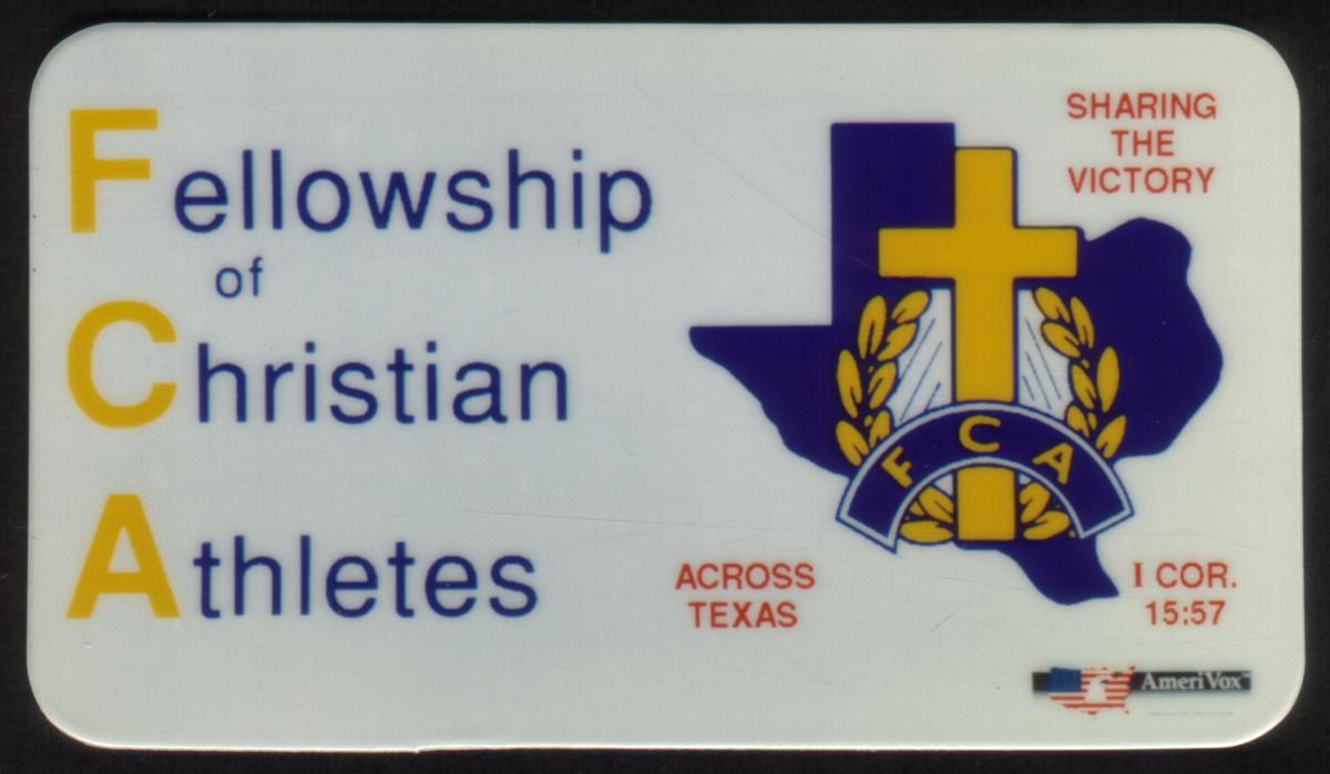 The card highlights a Christian message tied to student athletes and Bible studies, emphasizing the role of Jesus Christ and referencing 1 Corinthians 15:57, a scripture affirming victory through faith. The design connects the FCA organization to the state of Texas, dated 1992.