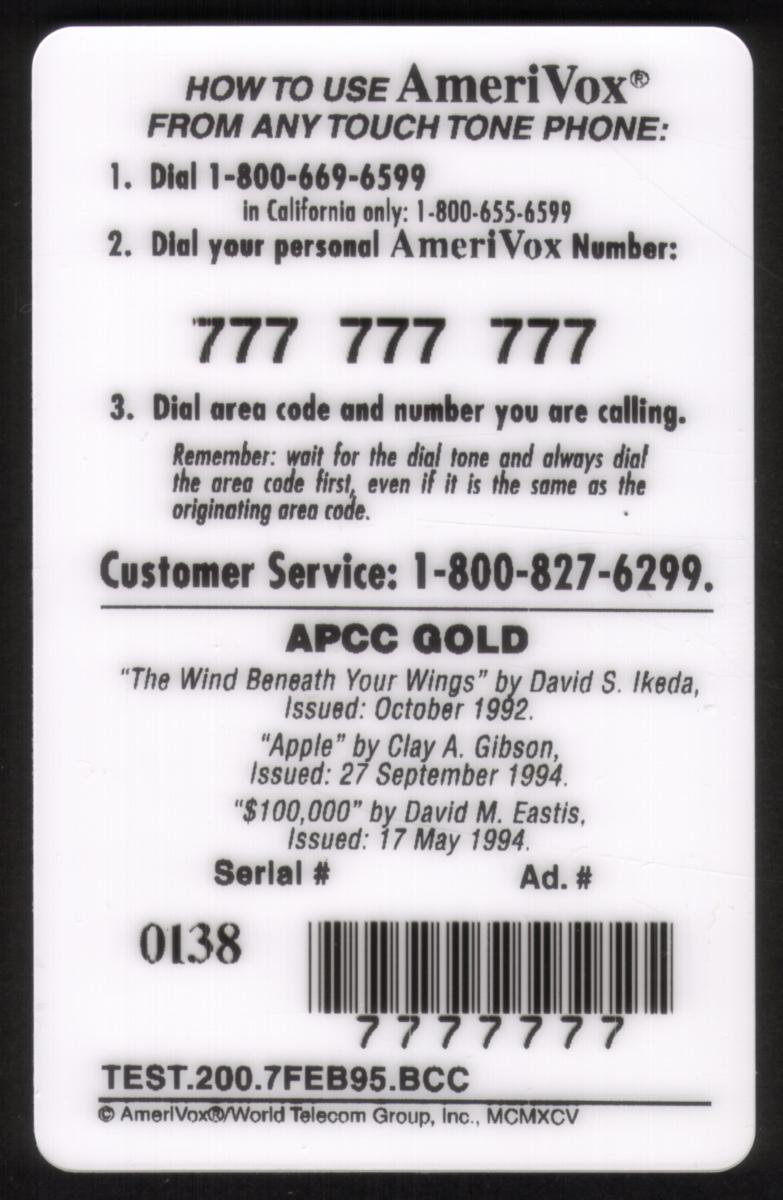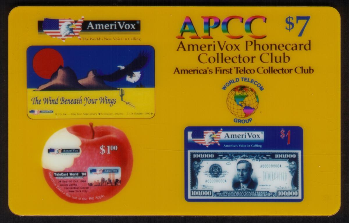 Keywords: Promotional, collectibles, telecard events, expos, artistic, currency, money, apples, birds, American Public Communications Counsel, twin towers, wtc, world trade center, wind beneath your wings, big apple, new york, fruit, food, AmeriVox