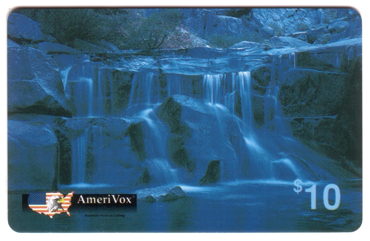 On the bottom left corner of the card, there is the AmeriVox logo, which consists of a stylized American flag inside the outline of the United States, accompanied by the text "AmeriVox." The card denomination, "$10," is printed in white at the bottom right corner. The overall design emphasizes the peacefulness of the waterfall under a nighttime setting, blending natural imagery with clear branding.