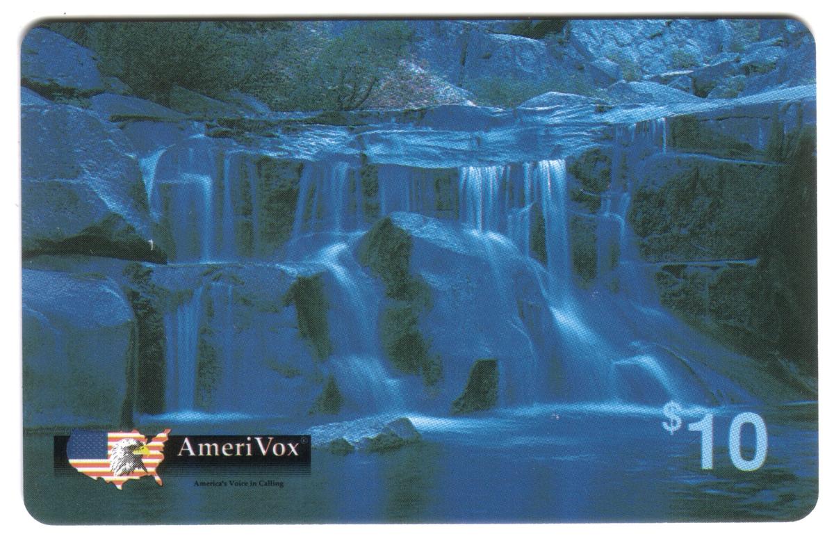 In the lower left corner, the logo of AmeriVox is presented with an illustration of the United States map filled with the American flag, overlaid with an eagle’s head. Below the AmeriVox logo, the text "America’s Voice in Calling" appears, highlighting the card’s issuer. The denomination "$10" is printed in white in the lower right corner, indicating its value.
