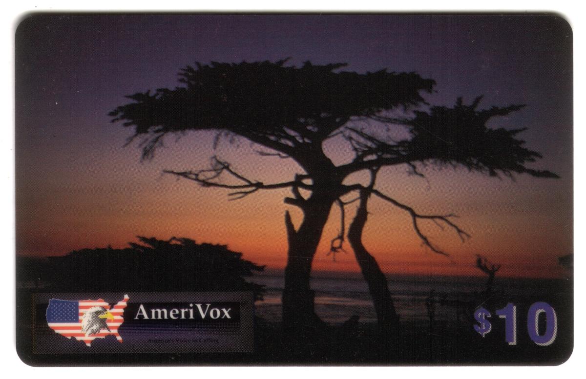This collectible phone card from AmeriVox features a scenic image of cypress trees silhouetted against a dramatic sunset sky. The card highlights the natural beauty of the landscape, with tall, slender cypress trees standing prominently in the foreground. The sky transitions through warm hues of orange and red near the horizon, blending into darker tones as it rises, creating a striking contrast with the dark shapes of the trees.