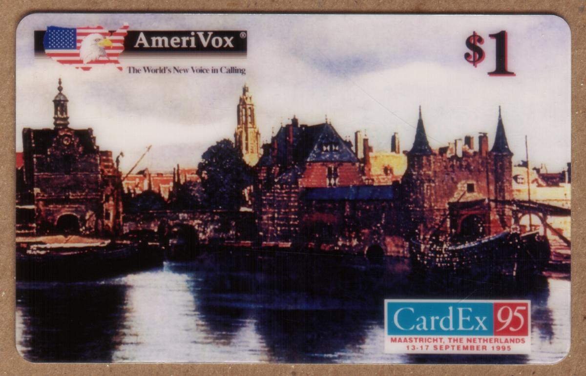 The card was issued for CardEx '95, an event held in Maastricht, the Netherlands. The designation "$1." appears clearly on the card, indicating its value. Additional text includes "Telecard Events" and "AmeriVox," the latter likely referring to the issuer or distributor. The overall design emphasizes artistic and architectural themes reflecting Dutch heritage.