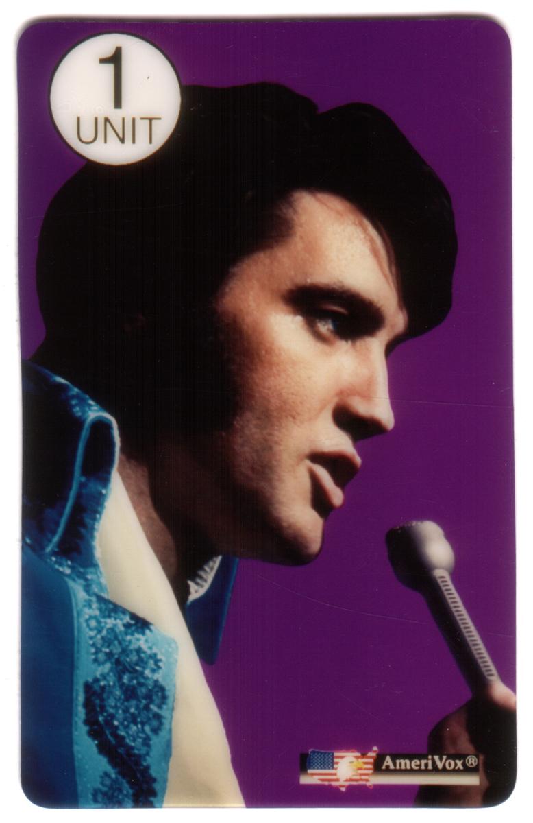Elvis Presley image on a prepaid card features a mid-performance pose, vibrant purple background, detailed costume, and a logo with American flag. |