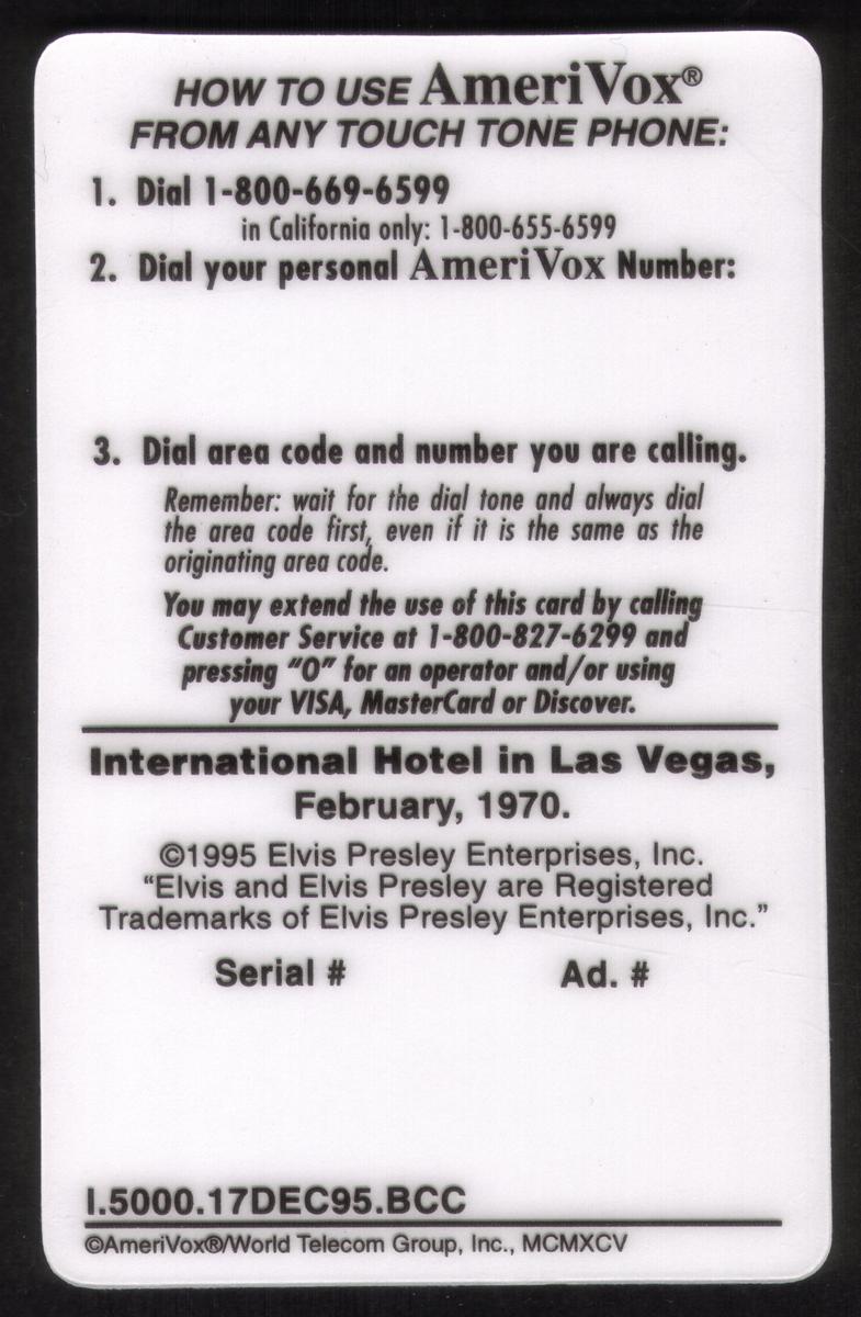 In the upper left corner, the card displays the denomination of "1 UNIT" within a white circle. The lower right corner includes the AmeriVox logo, accompanied by the American flag. The card relates to Elvis Presley as an American icon known for his influence in music, entertainment, and Hollywood. This collectible item highlights one of the singer’s legendary moments, specifically portraying Elvis during a 1970 performance in Las Vegas.