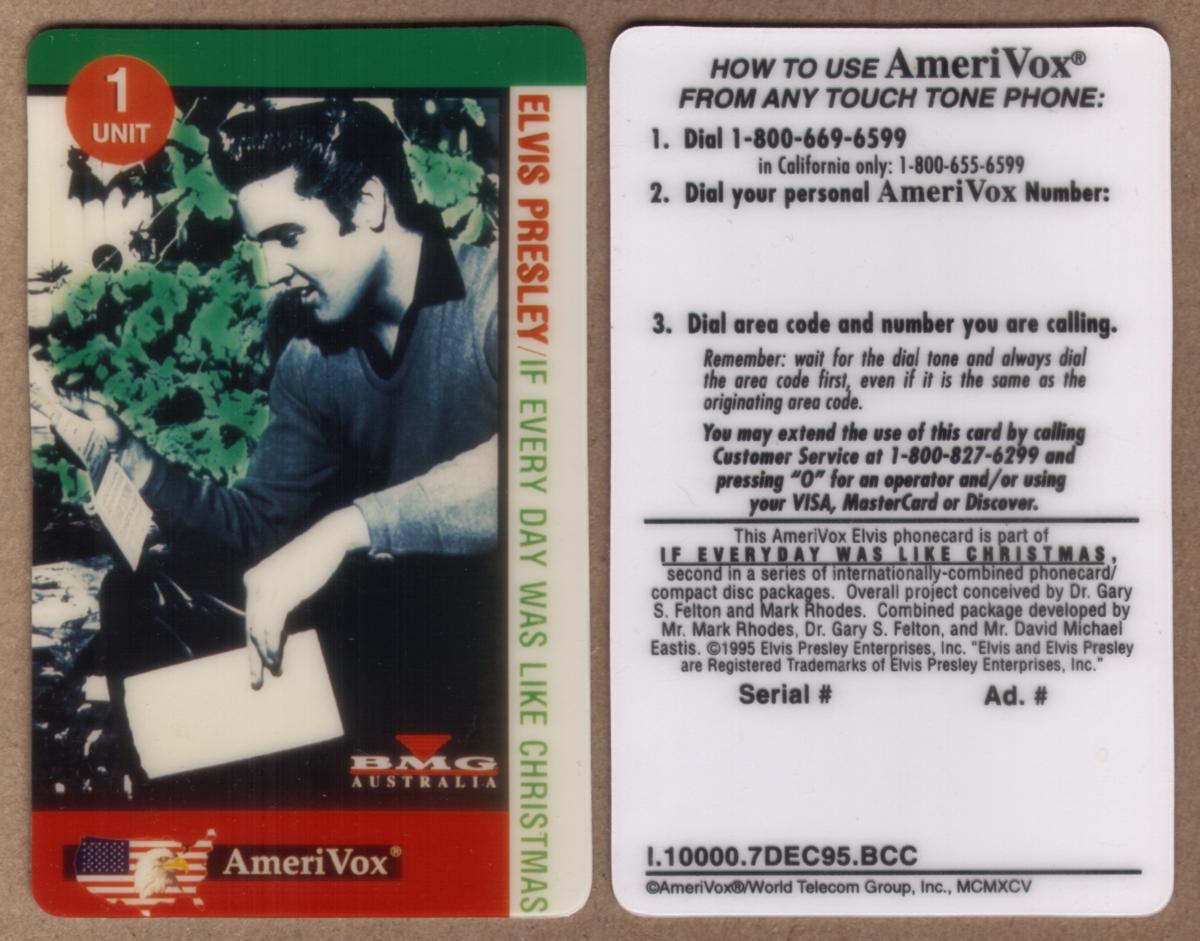 Elvis Presley holiday phone card featuring a black-and-white photo, official branding, and instructions, celebrating the King of Rock and Roll’s festive spirit. |