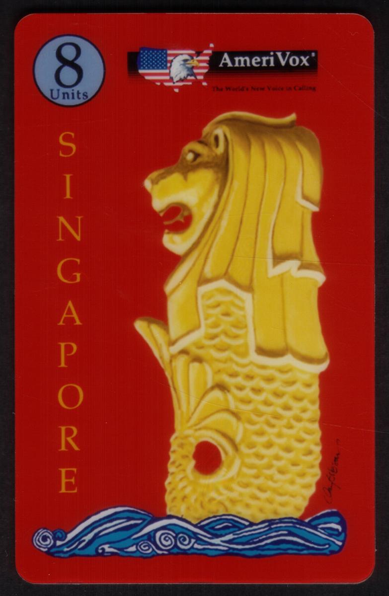 On the left side of the card, the word "SINGAPORE" is displayed vertically in yellow-orange letters. At the top left corner, a circular emblem indicates "8 Units" for phone usage. The top center of the card contains a small American flag graphic alongside the AmeriVox logo, accompanied by the tagline "The World's Best Voice in Calling." The artwork on the card is credited to Clay Gibson, as seen in small script near the bottom right section of the Merlion image.