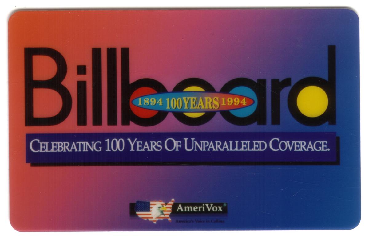 This is a collectible promotional phone card celebrating the 100-year anniversary of Billboard magazine, covering the years 1894 to 1994. The card features a vibrant gradient background transitioning from reddish-orange on the left to purple and blue on the right. The large "Billboard" logo is prominently displayed across the card, with the "o" in Billboard replaced by a solid yellow circle. Within the logo, an oval emblem highlights the years "1894 100 Years 1994" in yellow and red text on a blue background.