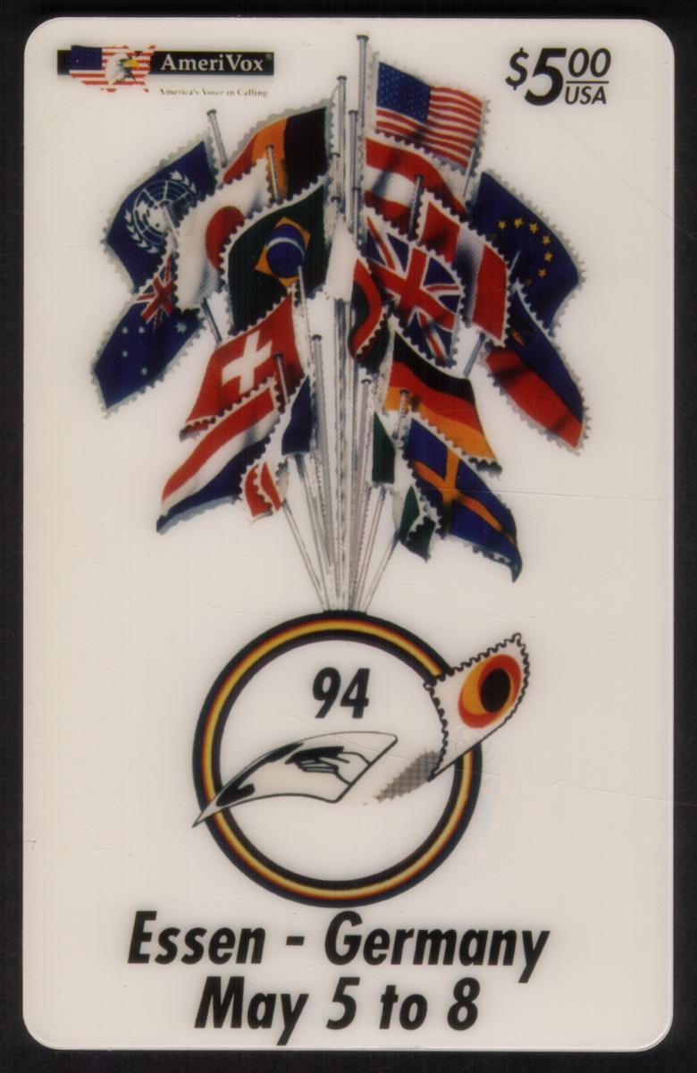 At the bottom of the card, the text reads: "Essen - Germany May 5 to 8," indicating the dates and location of the 1st International Phonecard Fair held in Essen, Germany, in May 1994. This specific card commemorates that event, bringing together international representation as symbolized by the flags.