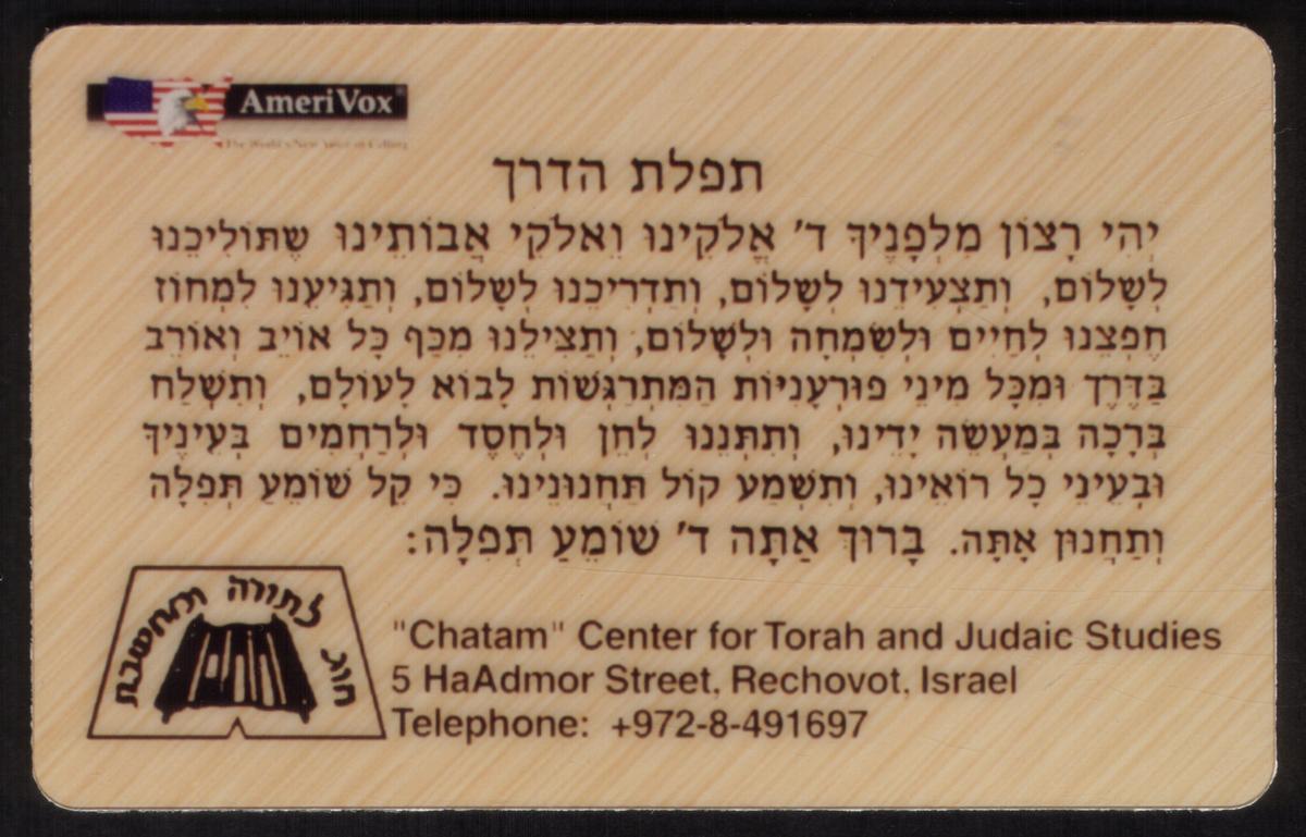 This collectible phone card features a religious theme linked to Judaica and Jewish heritage. It prominently displays Hebrew text alongside English, including the name "Chatam Center For Torah And Judaic Studies" and the city "Rechovot, Israel." The card highlights a Jewish prayer for travelers, indicating its cultural and spiritual significance within Jewish religious practices.