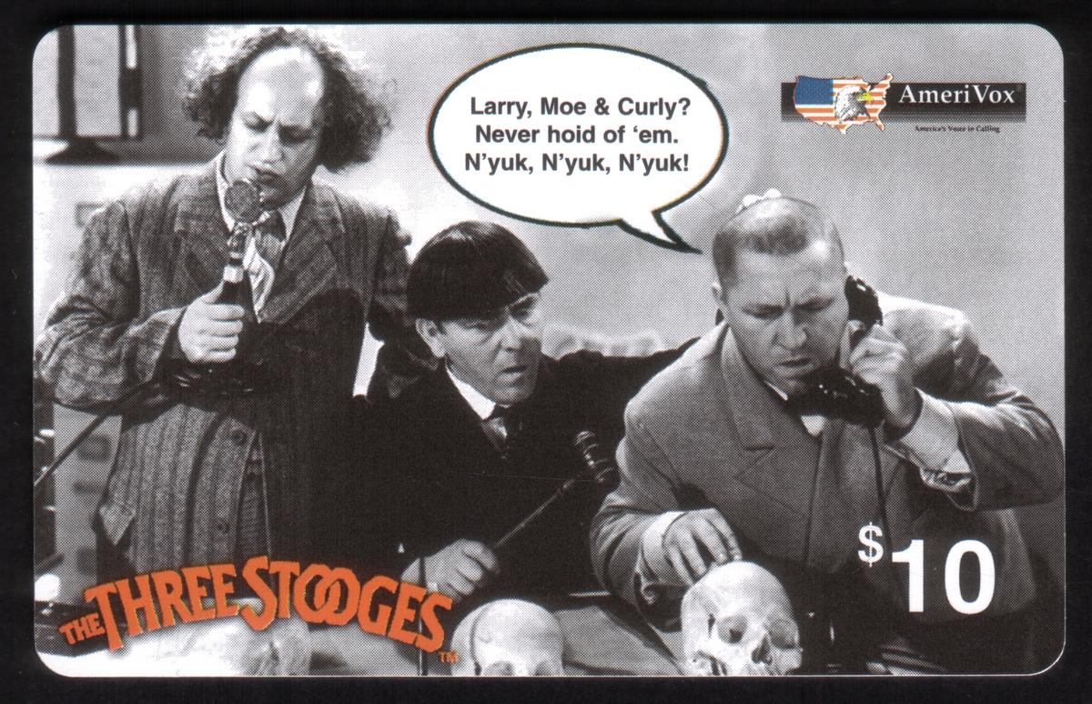 Three Stooges vintage phone card featuring black-and-white image, catchphrase, $10 denomination, logos, and macabre humor, blending comedy history with utility. |