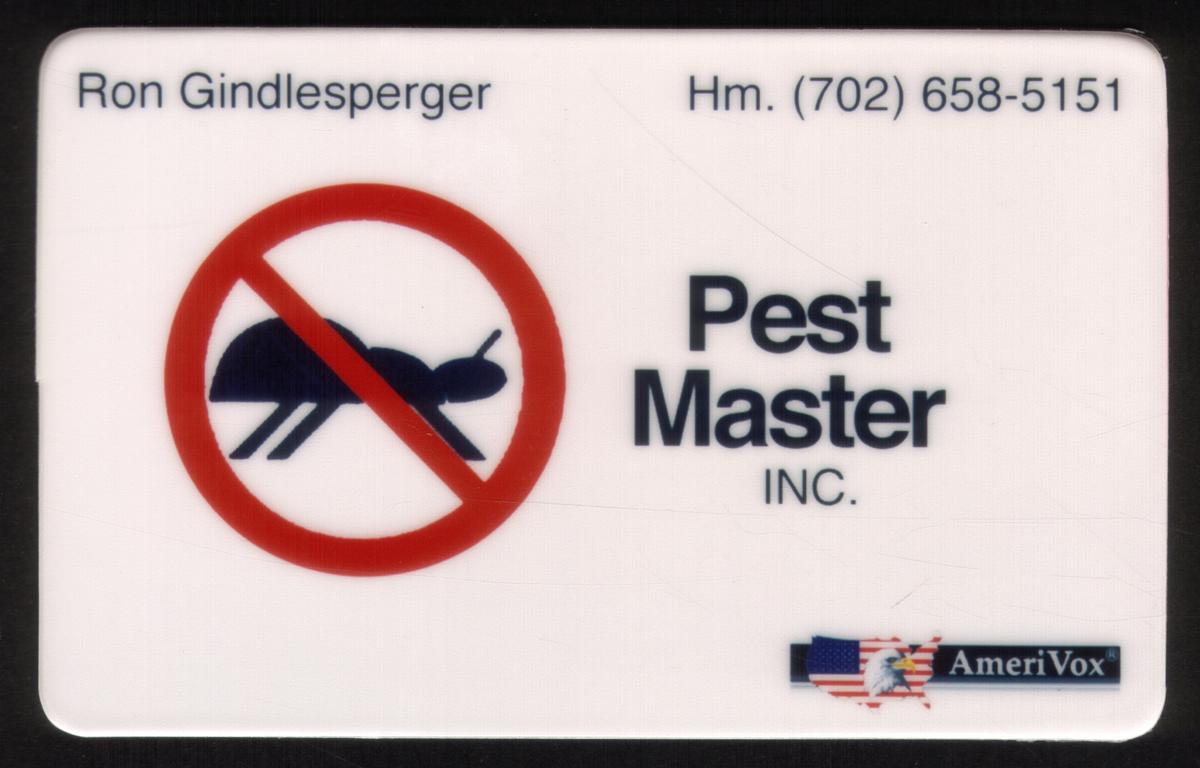 This collectible promotional business card features the Pest Master Inc. logo prominently displayed with the phrase "No Bugs Logo." The card includes the name Ron Gindlesperger, connected with Pest Master Inc. located in Nevada. The design integrates the AmeriVox branding, which appears alongside the company and individual names.