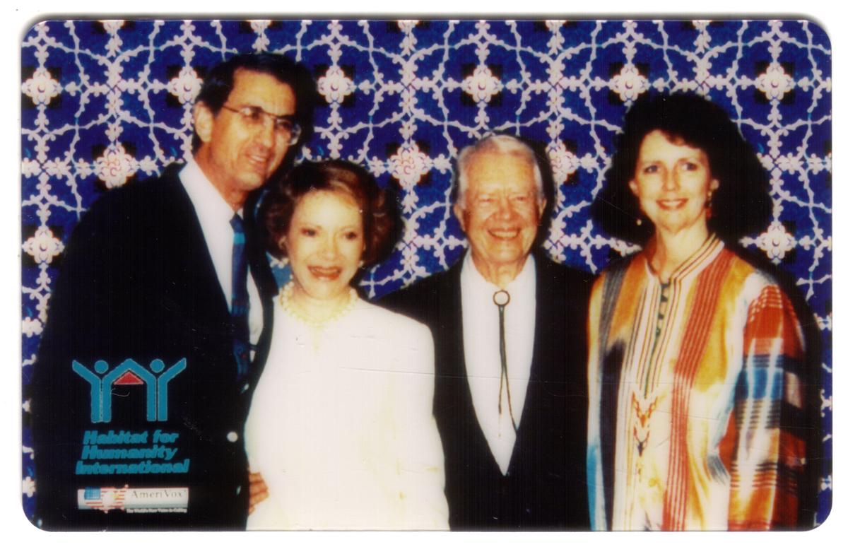 The card stands as a commemorative item highlighting the contributions of these individuals toward the work of Habitat for Humanity International. The clean presentation and specific naming make it a significant collectible for those interested in philanthropic history and phone card memorabilia.