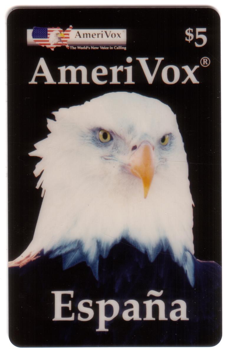 The card bears the text "AmeriVox Bald Eagle 'Espana'" in white lettering at the top right corner, accompanied by the word "PROOF" below it, indicating its collectible proof status. The denomination "$5" is printed in white near the lower left corner, marking its value. The overall color scheme contrasts the rich brown and white hues of the eagles with the subtle blues and whites of the sky, enhancing the visual appeal. The card is issued by AmeriVox, a company associated with collectible chip cards.