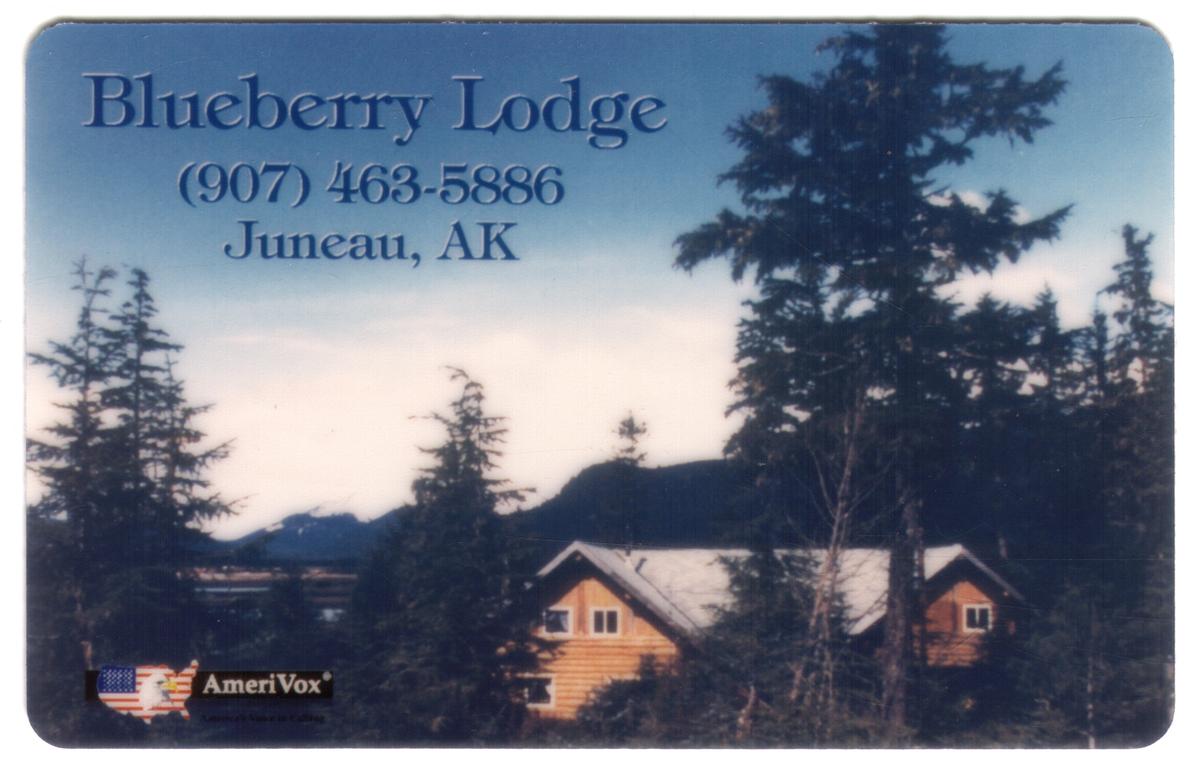 The design is clean, with the photographic backdrop extending across the card and easy-to-read text that emphasizes both the scenic value of the Blueberry Lodge and its location in Juneau, Alaska. The AmeriVox branding is placed discreetly but clearly, linking the card to its issuer. No other symbols, characters, or additional text are present on the front side.