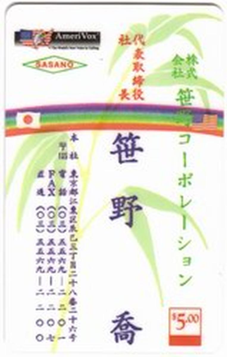 The card includes the text "Corporate Business Cards" and "sasano corporation," linking the design to a specific corporate entity. The denomination of $5 is displayed on the card, aligning with the value for collectible phone card purposes. It is a part of a series or set related to flags, as indicated by the keywords.