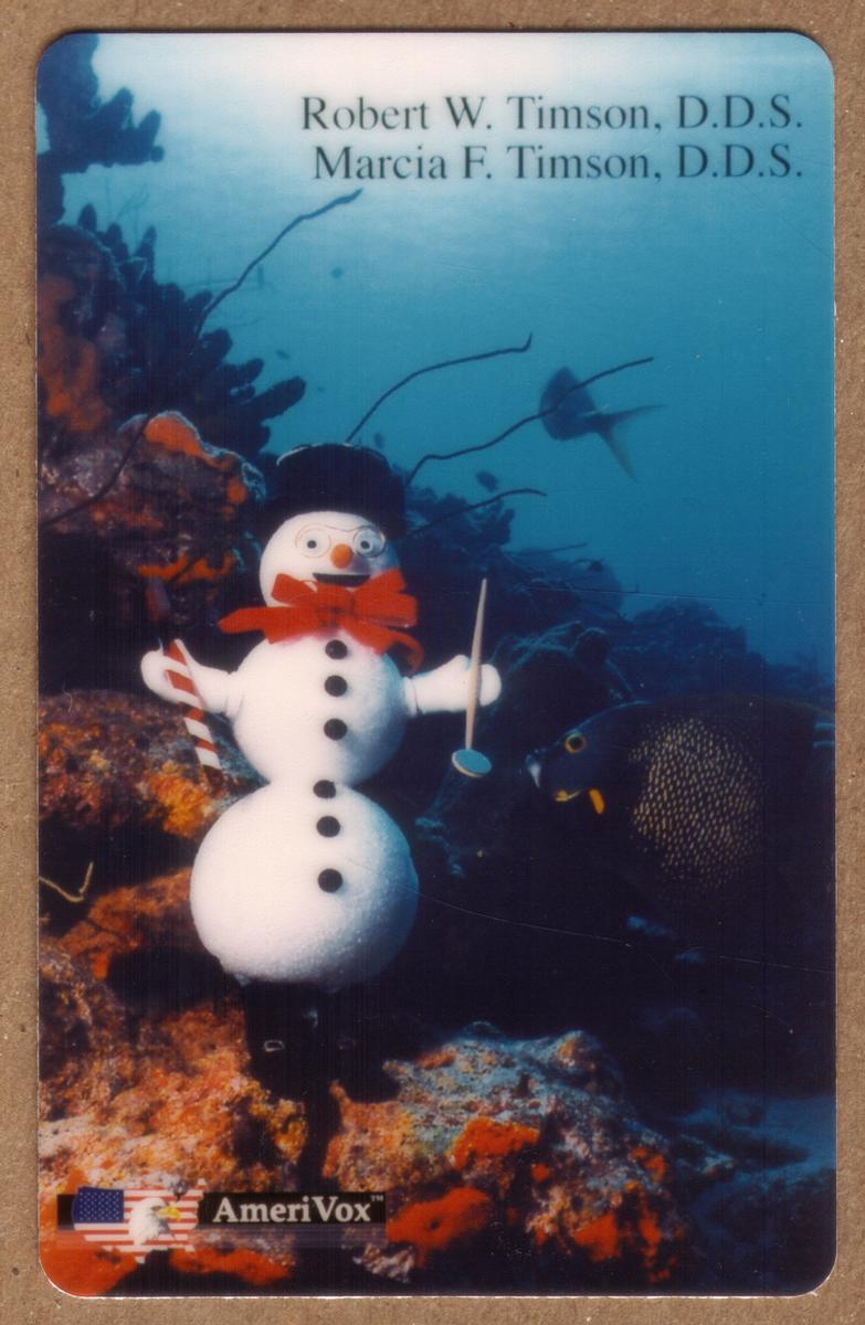 Overall, the card combines a scenic aquatic backdrop with holiday-themed snowmen inside a fish tank, along with promotional dental information for Robert and Marcia Timson. This visually striking design blends festive imagery with tropical fish and coral, making it a unique collectible piece.