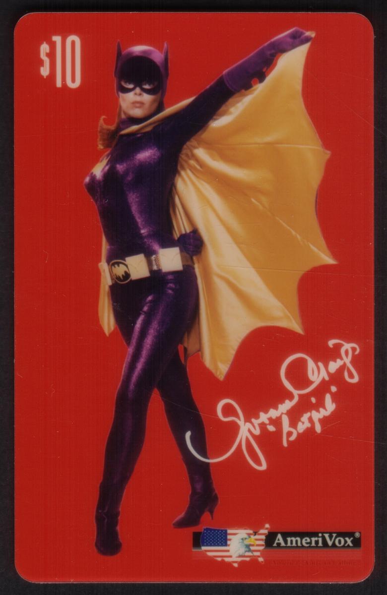 This collectible phone card features a full-body image of Yvonne Craig dressed as Batgirl against a solid red background. She wears a shiny purple costume with a yellow cape extended behind her, black gloves, and a utility belt. Batgirl's mask covers the top half of her face, and her red hair is visible flowing out the back.