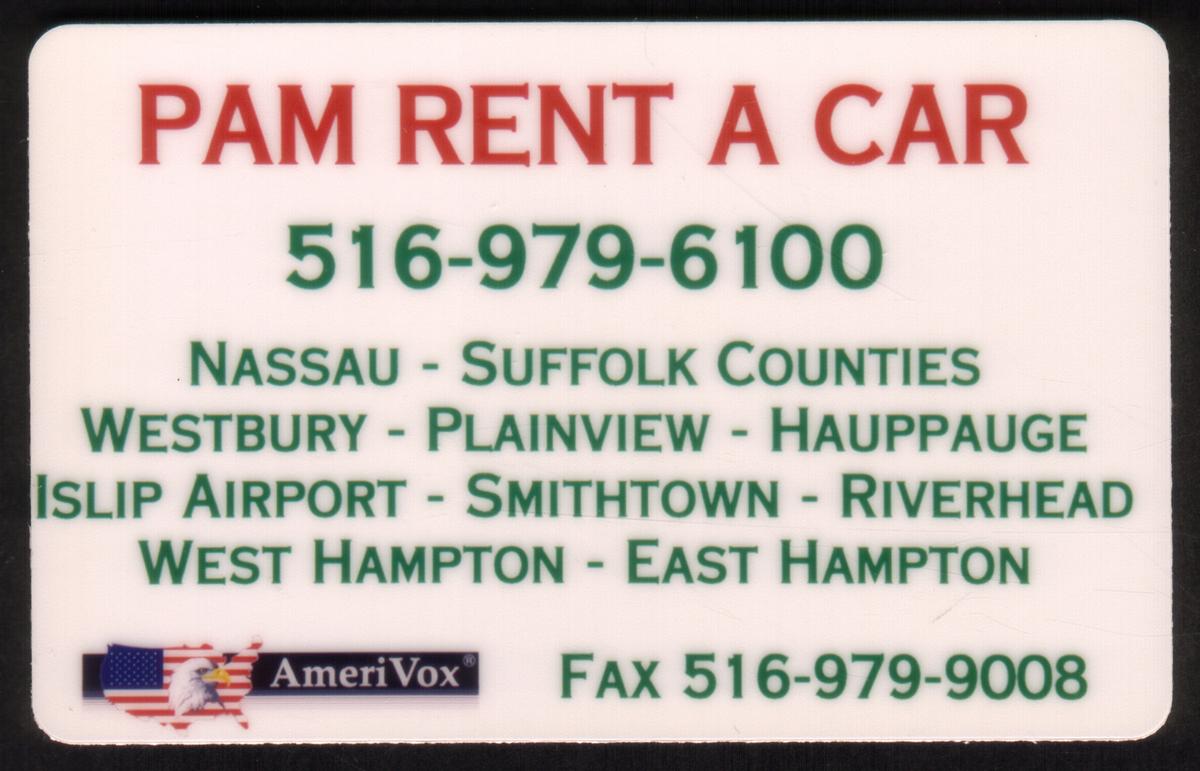 Promotional card for Pam Rent A Car highlighting Nassau and Suffolk Counties, Long Island locations, contact info, and service areas. |