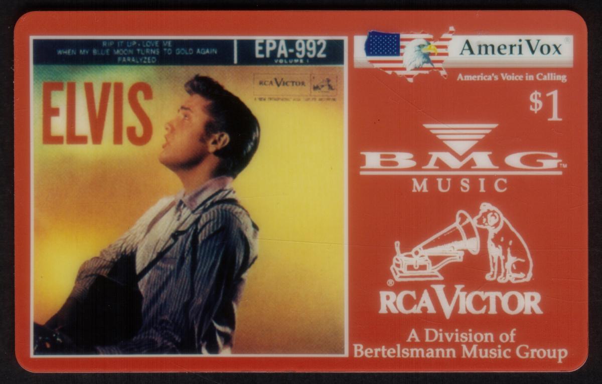 Elvis Presley themed collectible featuring vintage design, patriotic imagery, and a $1 prepaid calling feature, celebrating American music and pop culture. |