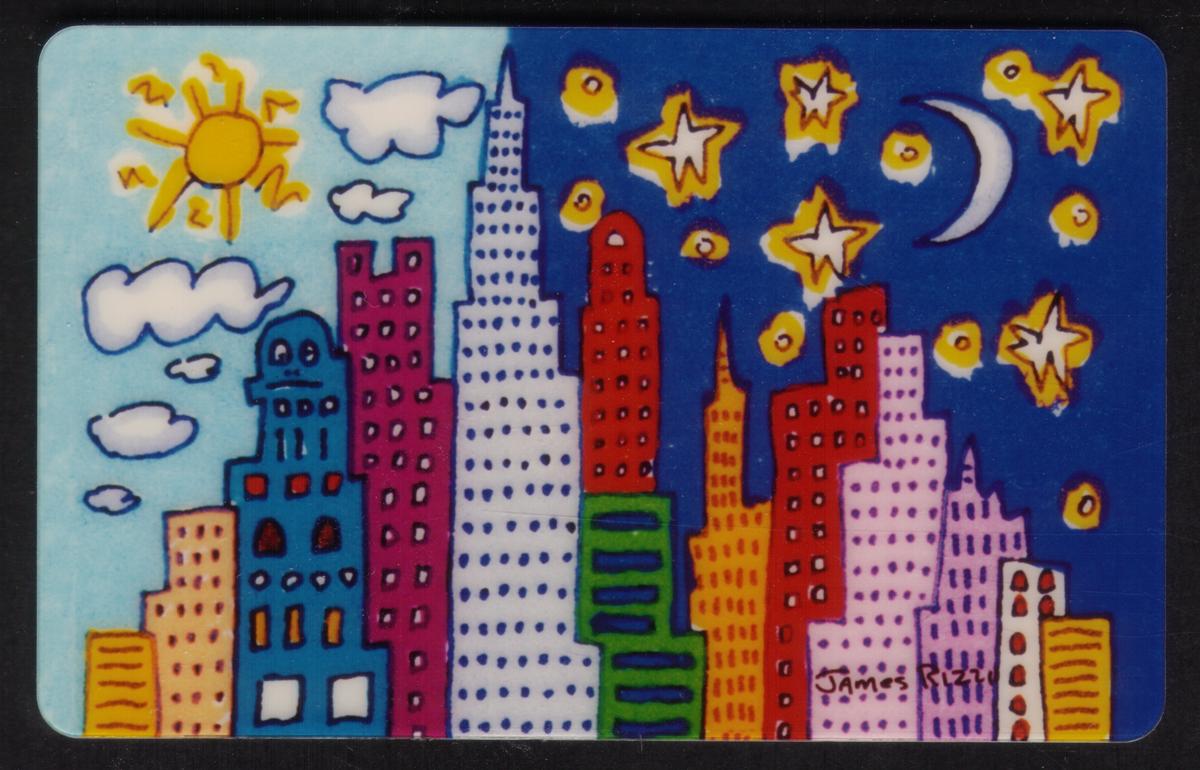 This collectible card features artwork by James Rizzi titled "Wake Up Sleepy Heads," showcasing a vibrant and whimsical depiction of the New York City skyline. The illustration uses bright, bold colors and playful, cartoon-like forms to represent various skyscrapers in the city, each painted with dotted or striped patterns. The buildings are colored in shades of blue, red, purple, yellow, green, and orange.