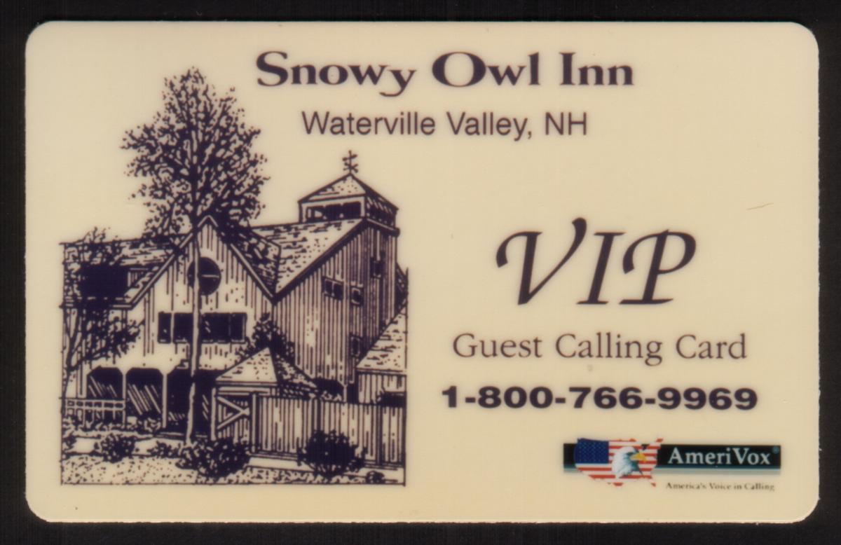 Overall, the card combines both functional and artistic elements, representing a corporate business card aimed at travelers or guests of the Snowy Owl Inn. The card reflects 1994 design elements consistent with travel and hotel guest calling cards issued by AmeriVox.