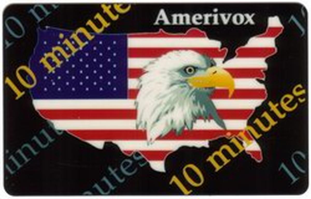 The card is associated with AmeriVox, as indicated on the front, and celebrates patriotic imagery connected to the USA. There are no other names or specific text visible besides those referring to the patriotic symbols and themes. The overall presentation is bold and vibrant, prominently showcasing American flags, maps, eagles, and red-white-and-blue color schemes that reflect deep American symbolism and patriotism.
