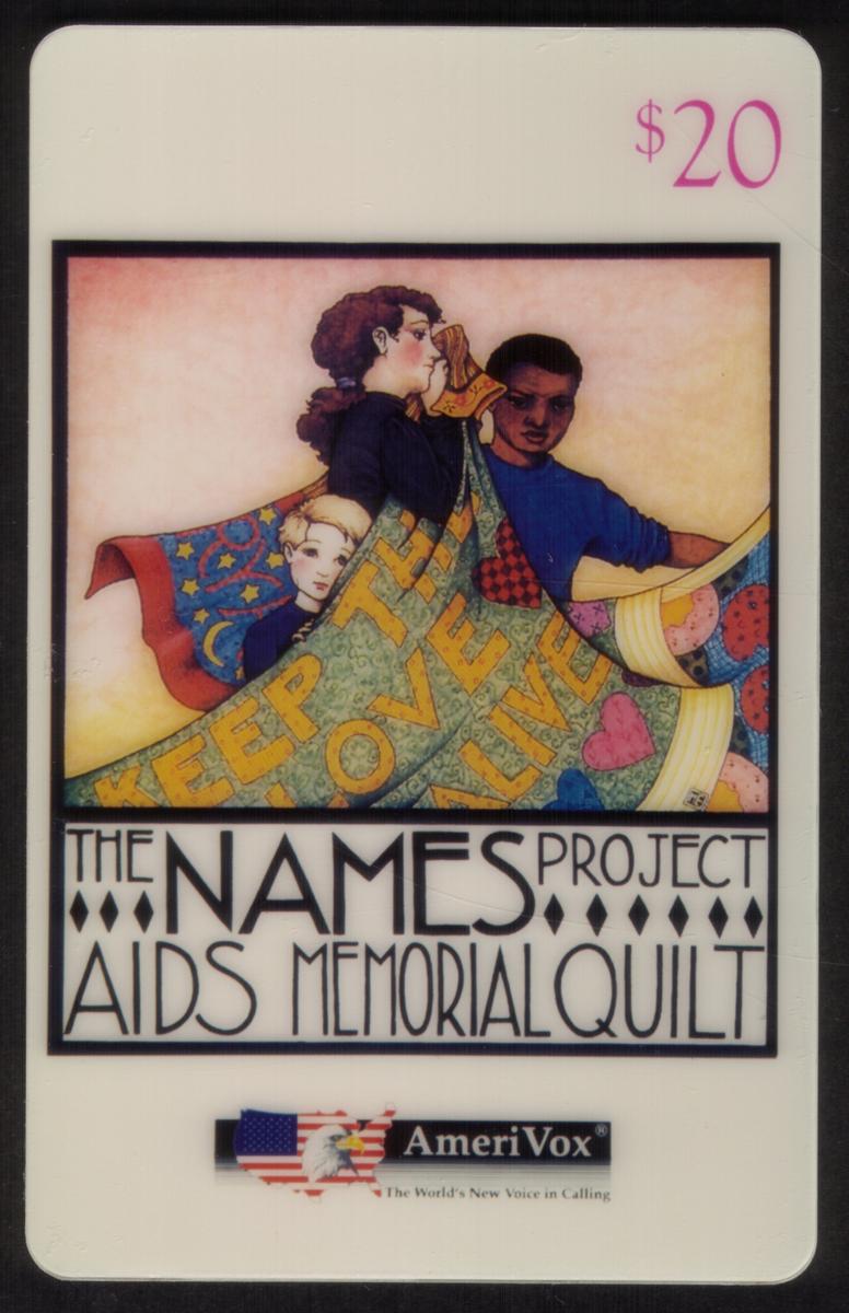 The card is valued at $20, prominently displayed in the upper right corner in bright pink. Below the main image, text reads "The Names Project AIDS Memorial Quilt," presenting a memorial tribute to those affected by AIDS. The AmeriVox logo appears at the bottom center of the card, with the tagline "The World’s New Voice in Calling" underneath, identifying the issuing company.