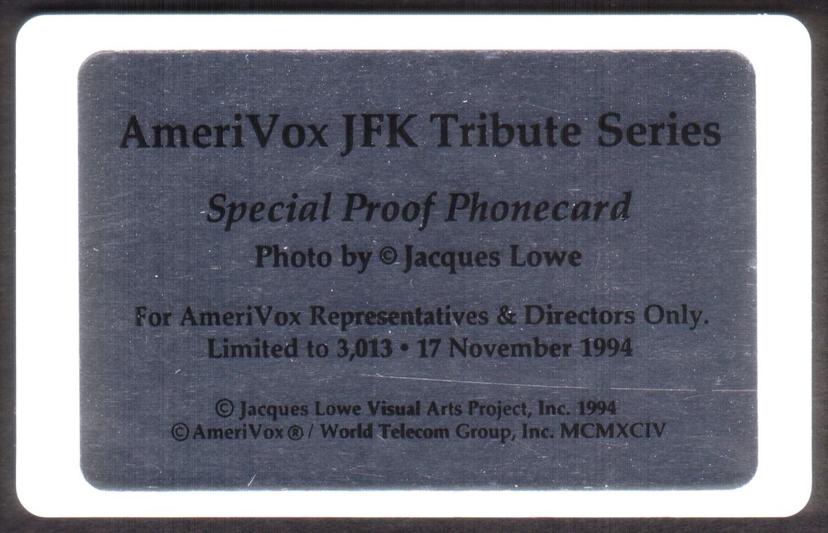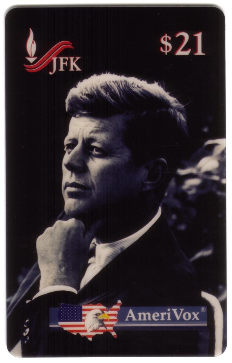 JFK black-and-white portrait phone card with patriotic emblem, $21 value, AmeriVox branding, and practical usage instructions on the back. |