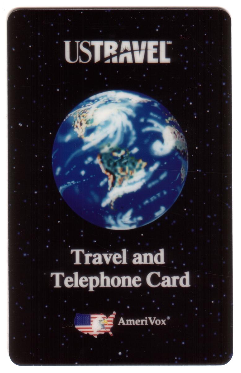 This phone card visually connects themes of space and global travel, likely promoting U.S. travel agencies and services related to telephone usage abroad. The design combines symbols of outer space and Earth with travel promotion and communication, making it a collectible item for those interested in travel, space imagery, or telecommunications.