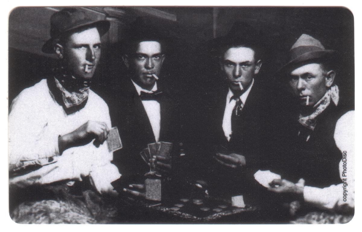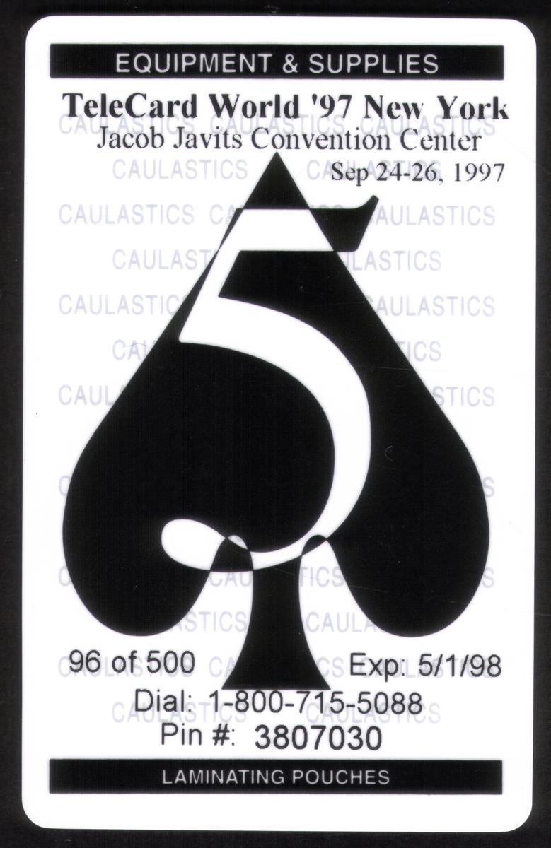 The card is part of a series related to playing cards with a gambling theme, notably men playing poker as indicated in the keywords. It is a promotional collectible card issued during a major telecard event in New York City in 1997, commemorating the Javits Center expo. The words "EQUIPMENT & SUPPLIES" and "LAMINATING POUCHES" also appear on the card, indicating a possible sponsor or related promotional supplier.
