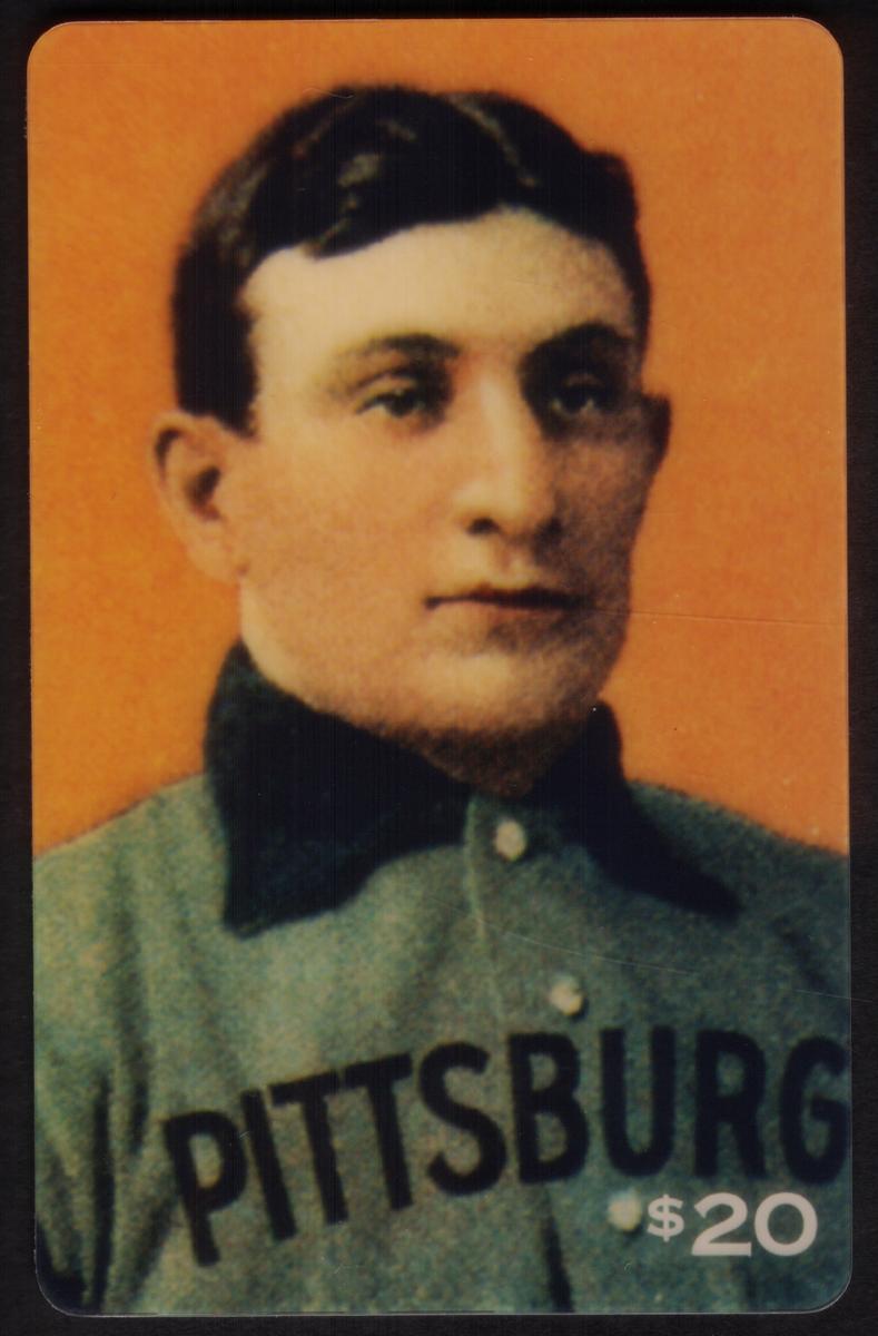 In the lower right corner of the card, "$20" is printed in white, indicating the card's value or denomination. This collectible is connected to the world of baseball memorabilia and ties directly to Wagner's historic role as a shortstop for the Pittsburgh Pirates. The card highlights Wagner’s significance in Major League Baseball history and is linked to the T-206 baseball card series, one of the most famous and sought-after baseball card series.