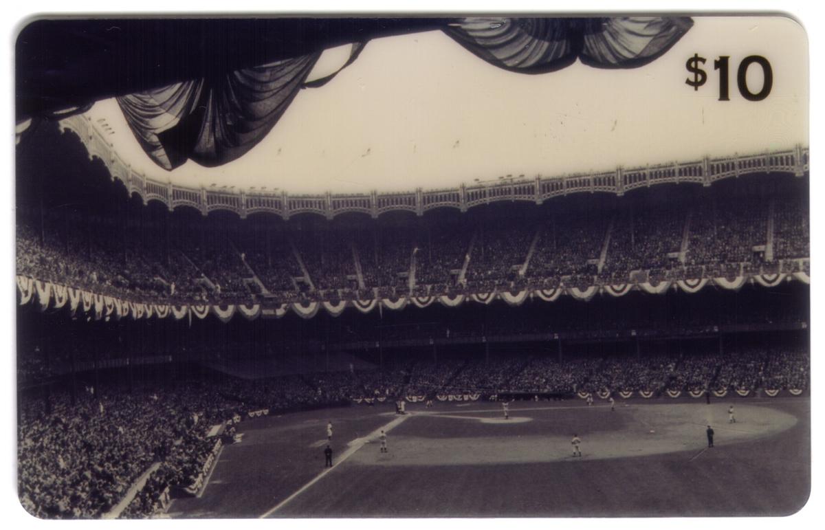 The card has a $10 denomination printed on it, and branding appears for LDDS Metromedia, linking it to the telecommunications company. This establishes the card as a collectible phone card related to baseball and sports facilities, specifically targeting collectors interested in MLB, Yankees history, and iconic sports stadiums.