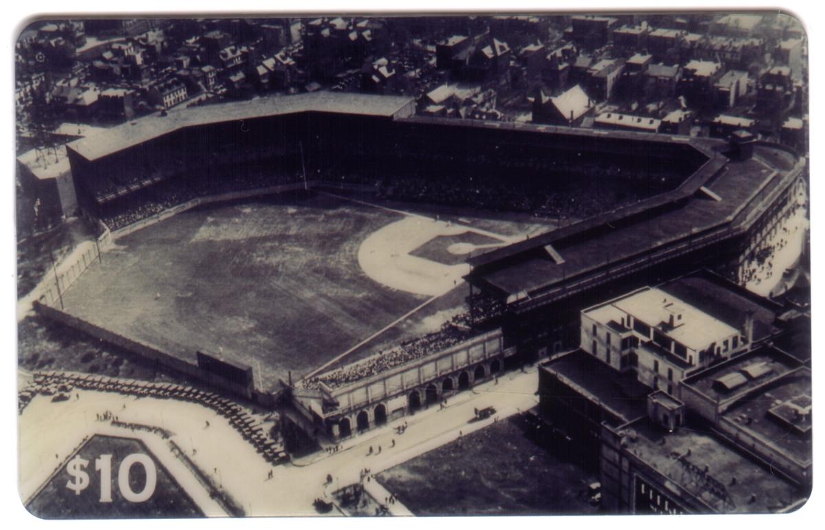 The design of the card includes the logos and branding for major league baseball, as well as the names "lddsmetromedia" and "Premier Marketing Group," indicating their involvement in the production or promotion of this collectible. The card’s denomination is $10, and it highlights the significance of Forbes Field in the context of baseball history and sports arenas.