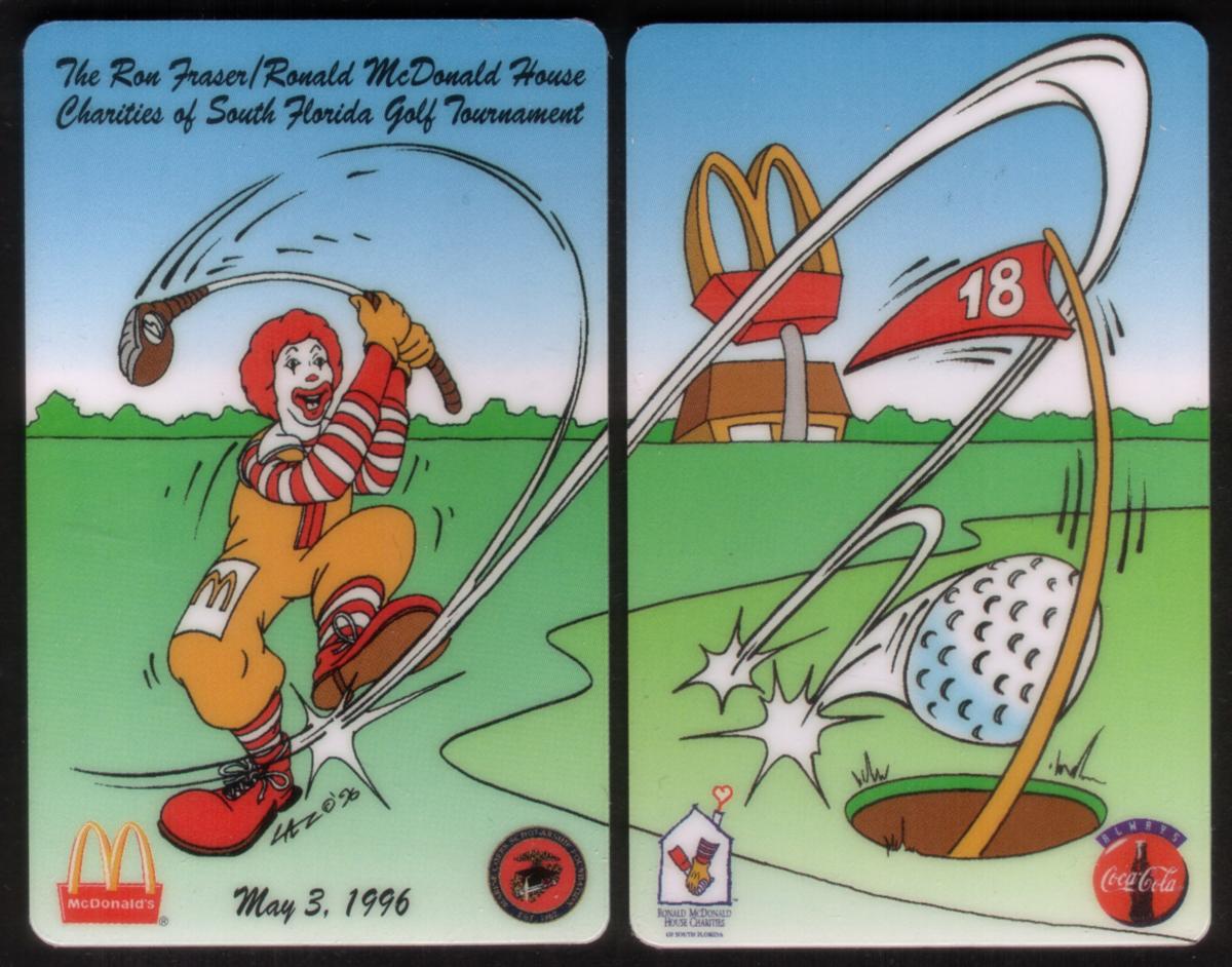 In the background, a clear blue sky contrasts with the lush green fairway. The card also includes the McDonald's "Golden Arches" logo in the bottom left corner. Text at the top reads "The Ron Fraser/Ronald McDonald House Charities of South Florida Golf Tournament," and the date "May 3, 1996" is printed at the bottom.