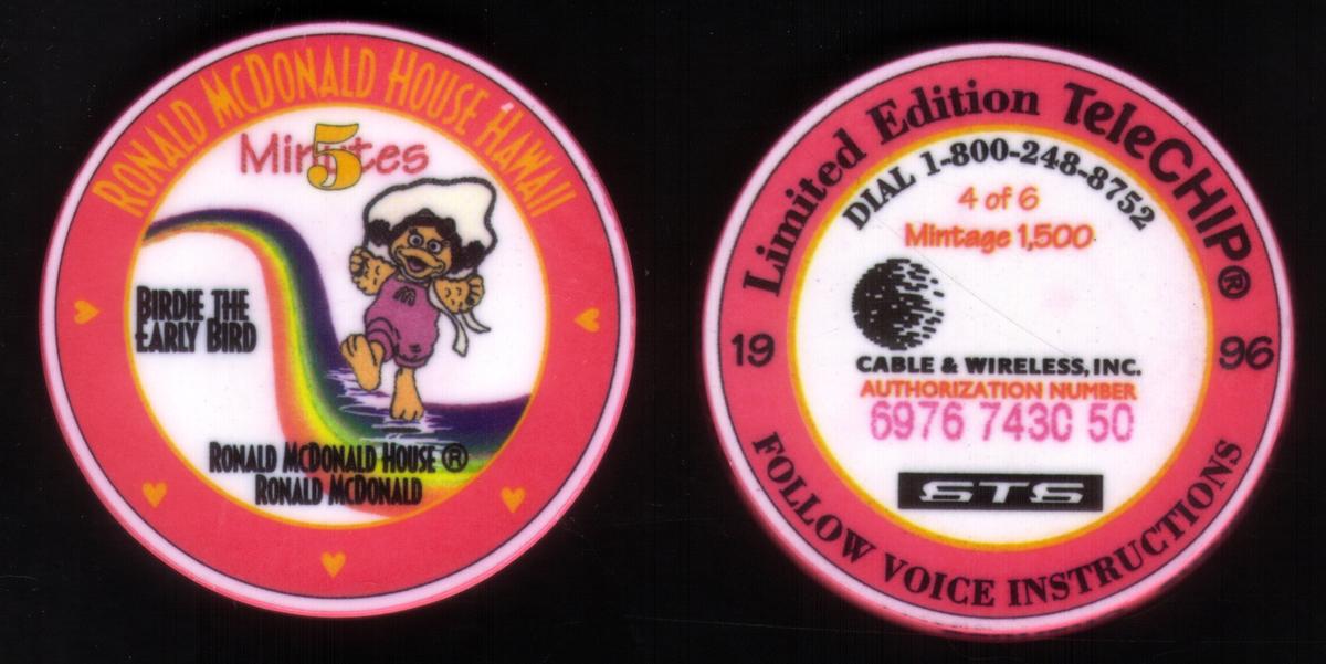 Limited-edition 1996 TeleCHIP phone card featuring Birdie the Early Bird, Ronald McDonald House Hawaii, vibrant design, and a limited mintage of 1,500. |