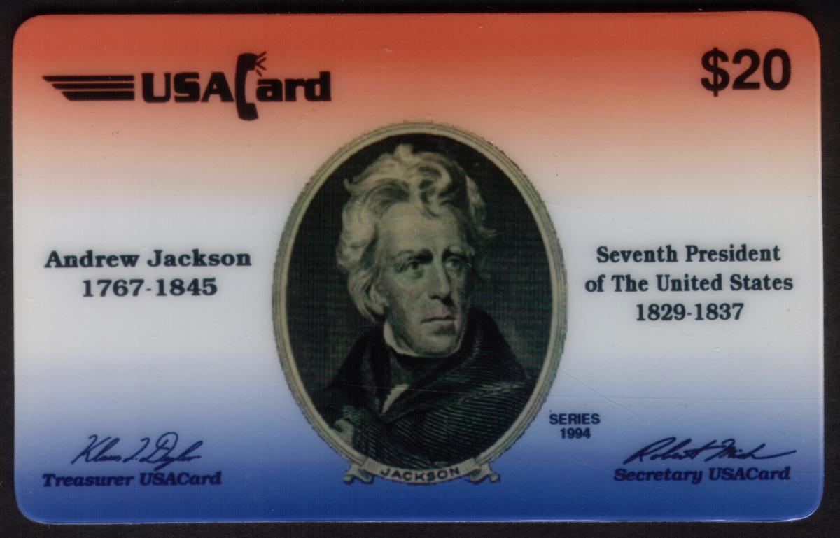 The card is marked with a $20 denomination in the upper right corner. In the upper left corner, the logo and name "USA Card" are prominent in black text. Below the portrait, two signatures appear: on the left is "Treasurer USA Card," and on the right is "Secretary USA Card." The card also includes the text "SERIES 1994" in small print to the lower right of the portrait.