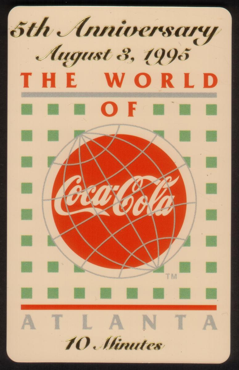 In the upper left corner, "The Score Board Inc." is printed in gold lettering, identifying the issuer of the card. The card's design has a clean, minimalist style focused on brand identity and celebration of the World of Coke’s fifth anniversary. There are no images or additional graphics aside from the various Coca-Cola logos and the text elements.
