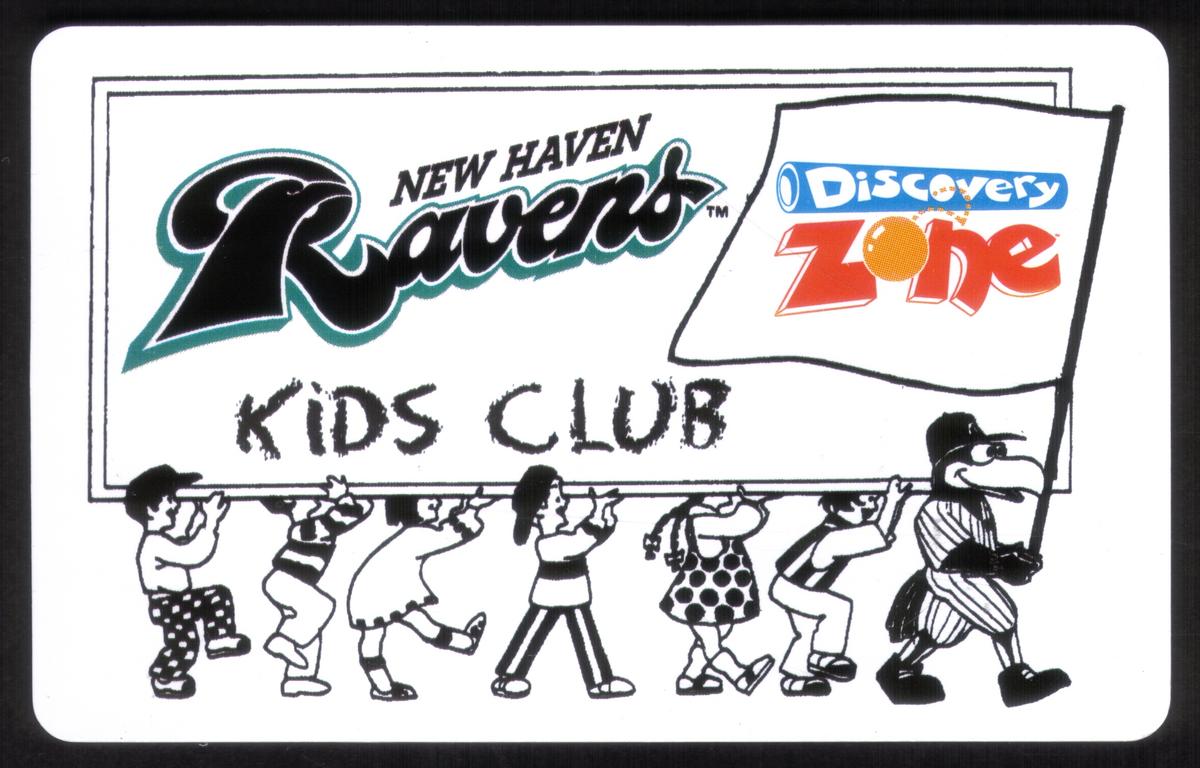 This card is connected to the New Haven Ravens Kids Club and the Discovery Zone, representing a promotional item or collectible related to children’s activities and baseball in New Haven. The card also includes the name "SNET," which refers to Southern New England Telephone, a regional telecommunications company.