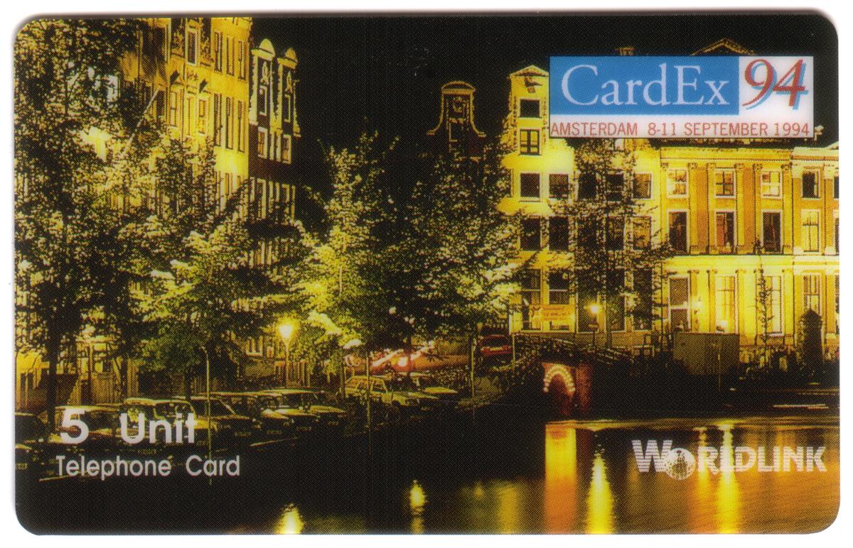 The card includes textual elements in English, identifying the location as Amsterdam and referencing the event "CardEx 1994 (Amsterdam 9/94)." The denomination marked on the card is "5u," indicating its value for use. The card also displays logos including "Telecard Events" and "WorldLink Commun," which are connected to the card’s issuance and communication network. The layout incorporates a combination of photographic imagery and important printed details, emphasizing its role as a collectible item from the 1994 CardEx event.