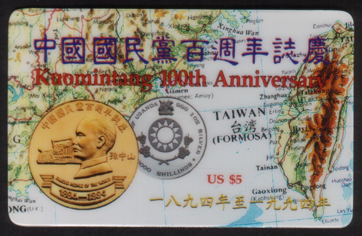 Commemorates Kuomintang''s 100th anniversary with Sun Yat-sen, detailed East Asia map, coins, bicultural text, and a $5 prepaid value. |